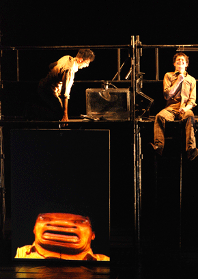Les protagonistes évoluent sur et autour d’un échafaudage, hérissé de caméras, écran, micros, scanner, rétroprojecteur, et tous éléments utiles à cette fabrique d’images. Zone de construction des aventures, la scène prend ainsi la forme d’une machine à raconter des histoires en duo, entre parole et image. La manipulation de ces machines de bric et de broc fait évidemment partie du jeu et appartient pleinement à ce langage scénique où toute image produite montre ses origines, où l'on voit aussi bien le processus de fabrication.